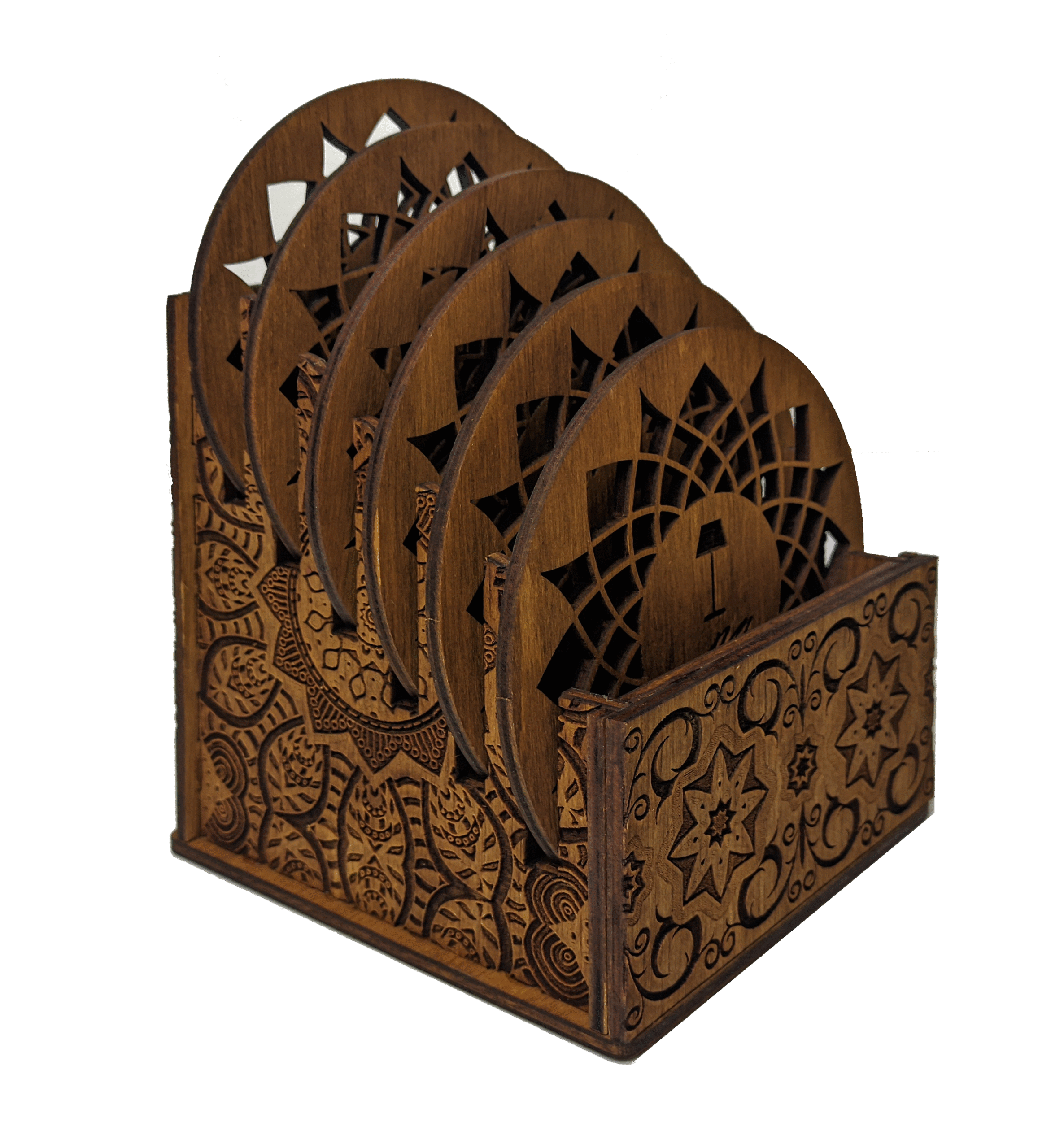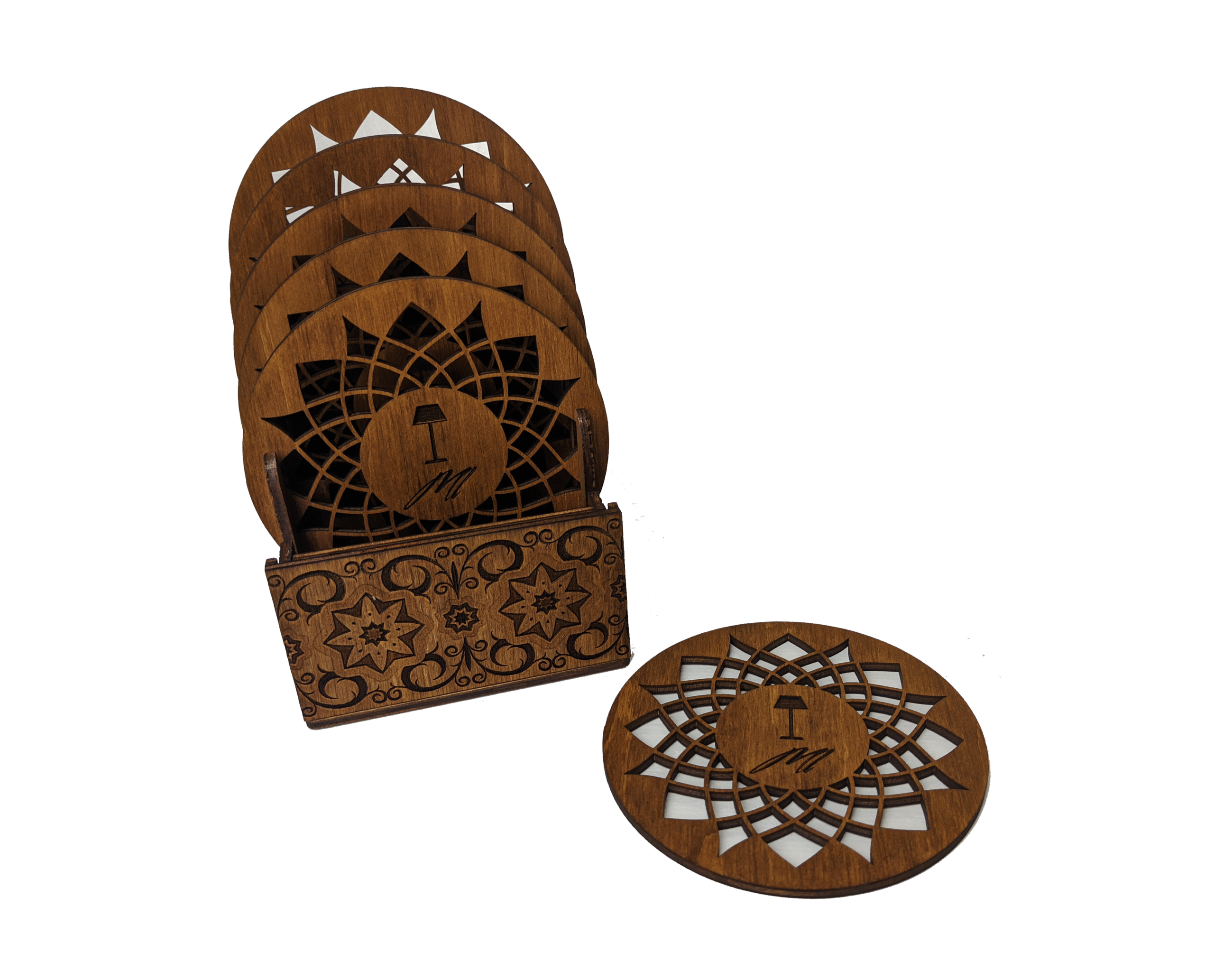 Подставочки под горячие напитки и холдер для них цвета «мокко». Диаметр подставки 10 см. Окрас и гравировка по согласованию.