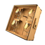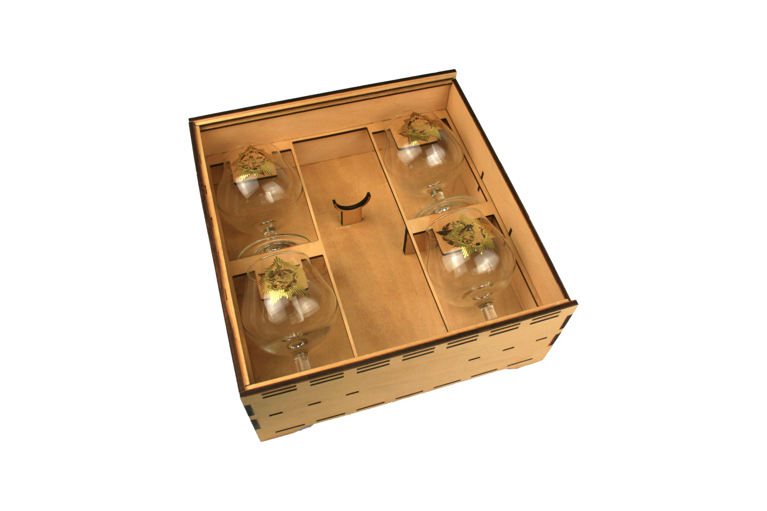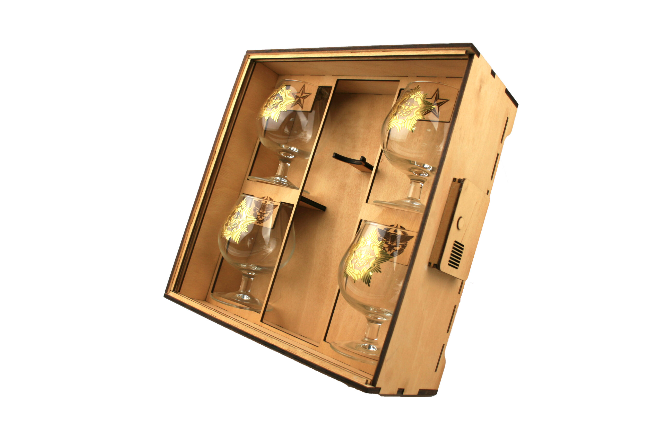 Сувенирный короб с бокалами станет отличным подарком любому мужчине! Короб открывается с помощью кожанного ремешка с кнопкой. Возможно нанесение индивидуальной гравировки по согласованию.