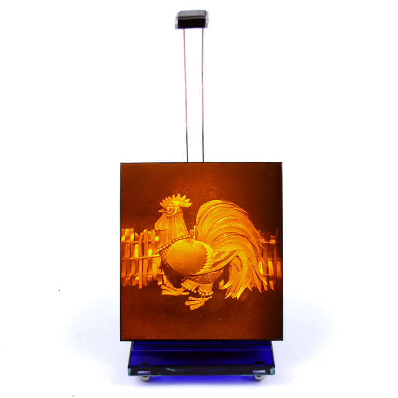 Голограмма может быть выполнена как в деревянном обрамлении, так и на стеклянном основании. Подсветка осуществляется с помощью светодиода, который работает от батареек или USB-порта.