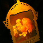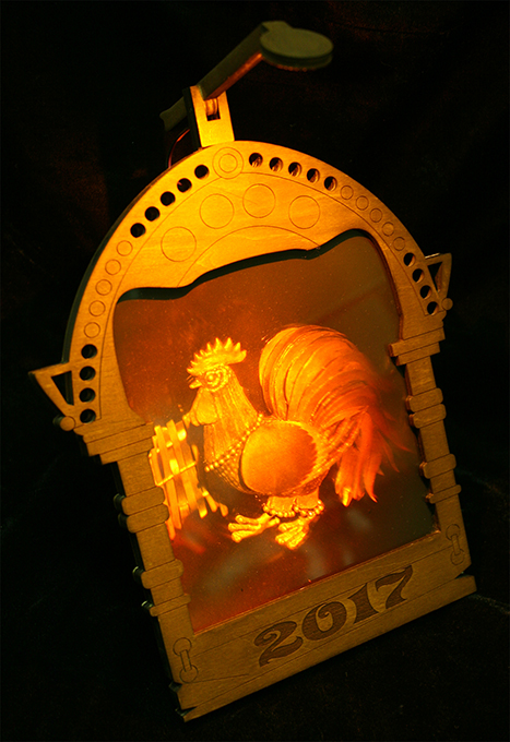В комплект входит сама голограмма петуха и батарейки.