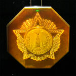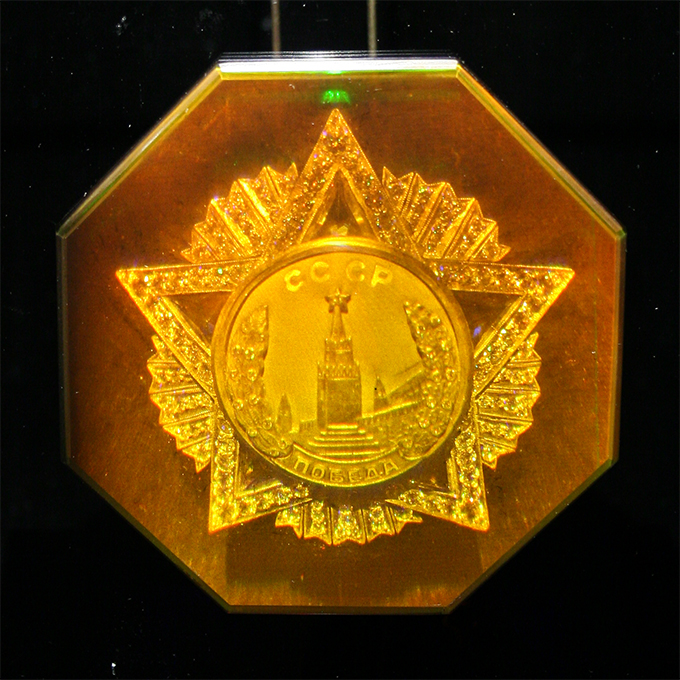 В комплект входит сама голограмма ордена и батарейки, а так же подарочная упаковка из экокожи размером 30х16х15,5 см